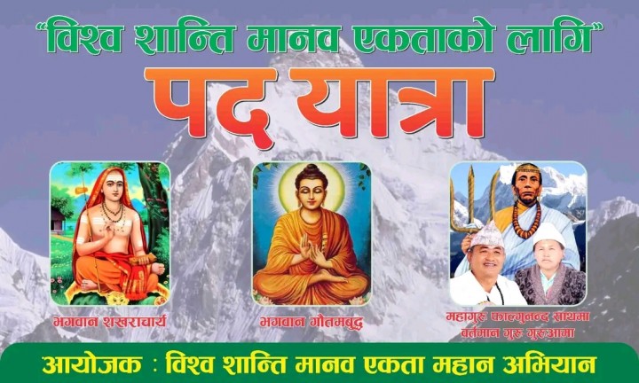 काठमाडौ ।विश्व शान्ति तथा मानव एकता अभियान अन्तर्गत बिश्व शान्ति तथा मानव एकताका लागी "राष्ट्रिय तथा अन्तरास्ट्रिय शान्ति यात्रा"सहित विभिन्न कार्यक्रमको आयोजना हुने भएको छ । विश्व शान्ति तथा मानव एकता अभियान आयोजक र १०० भन्दा धेरै संघसंस्थाको सहभागितामा कार्यक्रमको आयोजना गर्न लागिएको हो। कार्यक्रम अन्तर्गत पहिलो चरणमा देशव्यापी शान्ति यात्रा , तथा विभिन्न धर्मका धर्म गुरुहरुको सहभागिता मा बृहत धर्म सभा तथा शान्ति सम्मेलन गरिने र दोश्रो चरणमा भारत ,भुटान,बर्मा, थाइल्यान्ड,दक्षिण कोरिया ,हङकङ,जापान सहितका मुलुकहरूमा शान्ति यात्राको लागि तयारी भइरहेको कार्यक्रम संयोजक राजभक्त योङ्या "मिधुङ" ले जानकारी दिएका छन् । नेपाल लाई किराँत ,बौद्ध र सनाखत( हिन्दु) धर्मको त्रि धार्मिक स्थल र शान्ति भूमिका रुपमा बिकास गरि किराँत तथा हिन्दु धर्मको उद्गम स्थल र भगवान बुद्धको जन्मभूमि नेपाल लाई विश्व सामु चिनाउने उदेश्यले यात्राको मुख्य नारा (स्लोगन) "buddha was born in Nepal " राखिएको र कार्यक्रमको तेस्रो चरण अन्तर्गत नेपालमा " विश्व शान्ति सम्मेलन को आयोजना गरिने संयोजक योङ्याले जानकारी दिएका छन् ।